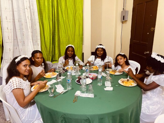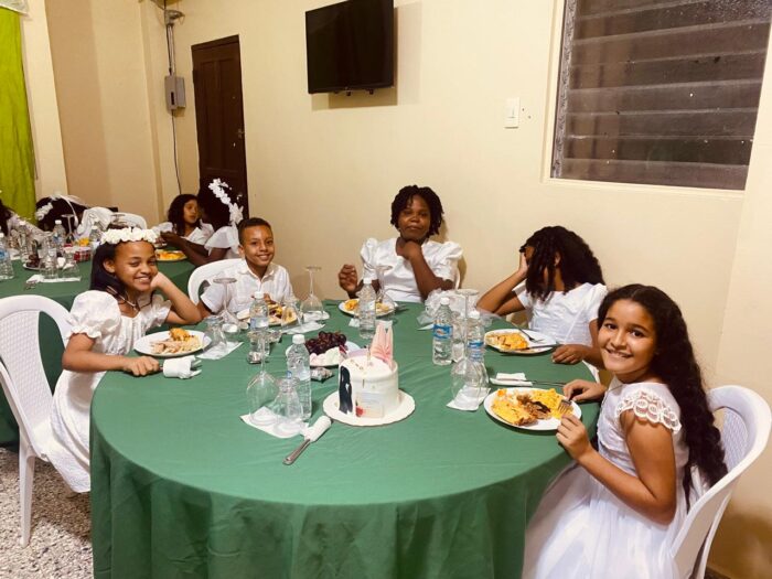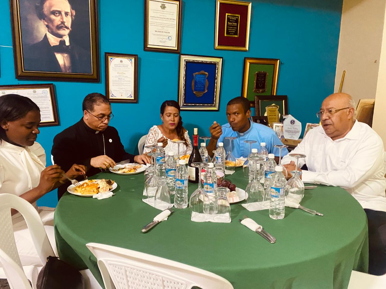 Cena con el obispo, Santiago Rodríguez Rodríguez, el padre Alberto, los Regidores, una comisión de la iglesia católica y los niños que hicieron la primera comunión.