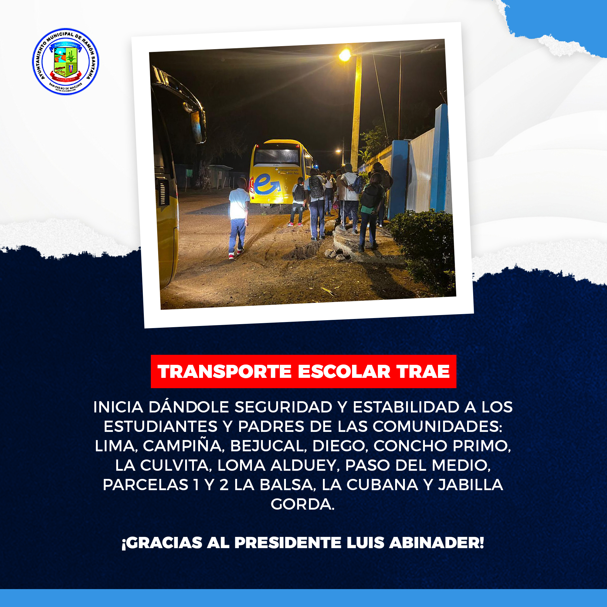 Cuando se tiene un gobierno al servicio de la gente, los servicios llegan, el transporte escolar #TRAE inicia dándole seguridad y estabilidad a los estudiantes y padres de las comunidades de: Lima, Campiña, Bejucal, Diego, Concho Primo, La Curvita, Loma Alduey, Paso del Medio, Parcelas 1 y 2 La Balsa, La Cubana y Jabilla Gorda.