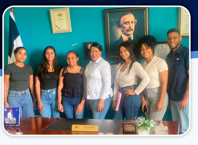La alcaldesa del municipio, Santa Valdez, recibió con entusiasmo en su despacho a un grupo de destacados estudiantes de la Facultad de Ingeniería y Arquitectura de la Universidad Autónoma de Santo Domingo (UASD): Jennifer, Melody, Karen, Erik, Litzy y Wilkeira.